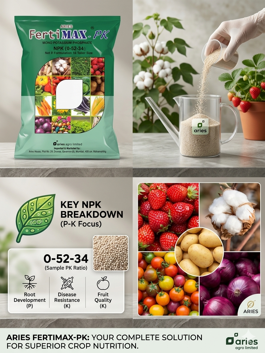 Aries FertiMAX-PK is a high-quality, 100% water-soluble fertilizer specifically formulated as Mono Potassium Phosphate. It is designed to provide a concentrated dose of Phosphorus (P) and Potassium (K) during critical growth stages when Nitrogen is not required.